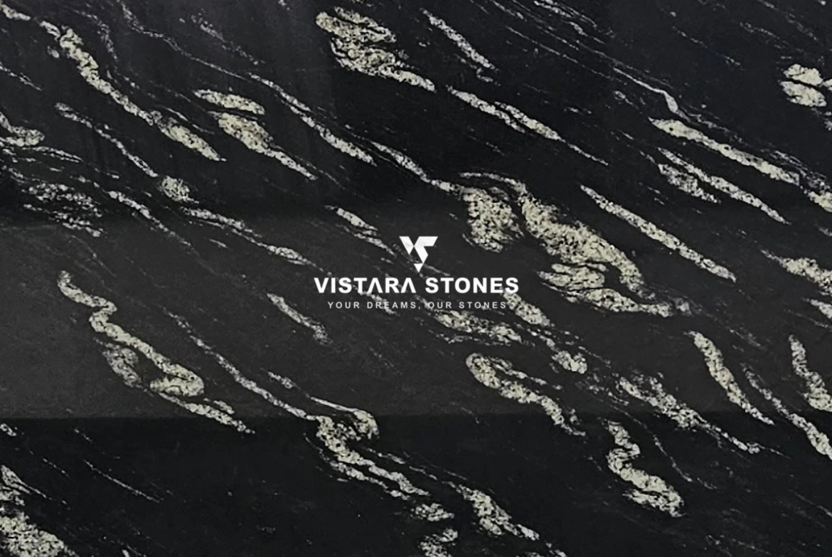 This is a type of granite known for its predominantly black coloration. This granite typically features a deep black background with minimal variations in color, creating a sleek and uniform appearance. It contains flecks, veins in predominantly white color.